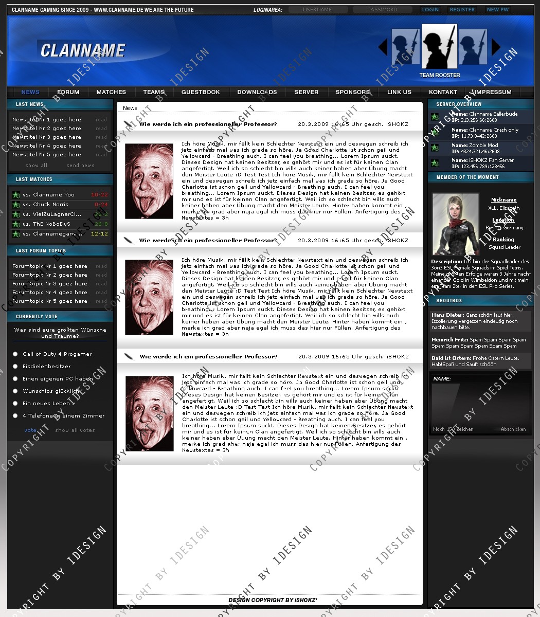 Dies ist ein professionelles Clandesign. Eine übersichtliche und geordnete psd Datei mit allen vorhandenen Ebenen ist vorhanden. Bei weiteren Fragen oder Support wenden sie sich per E-mail an "[email protected]" Dieses Design gibt es auch in blau. Schaut bei meinen Produkten