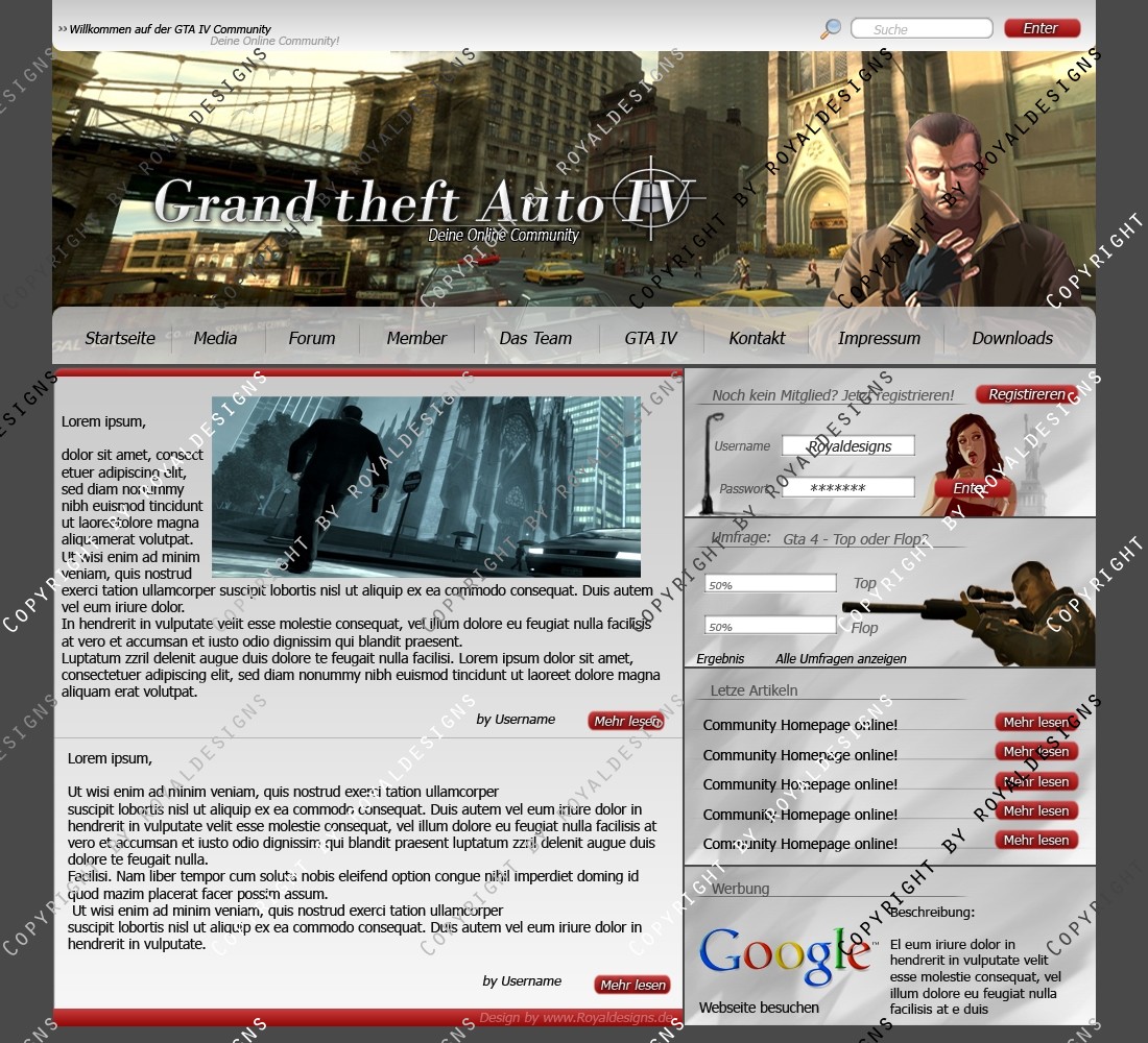 Das Design ist an eine Community angelehnt. Speziell auf eins für das berühmte Spiel des Jahres "Gta IV". Es sind einige elemente eingearbeitet worden, z.b. in dem Loginbereich und weiter runter. Die Gestaltung nimmt die Farben Rot / Weiß an und so ist es geblieben, schlicht und einfach gehalten.Im Packet wären folgende Sachen enthalten: - .psd Datei des Designs - WerbebannerHeader und weitere kleinigkeiten können kostenFREI geändert werden.