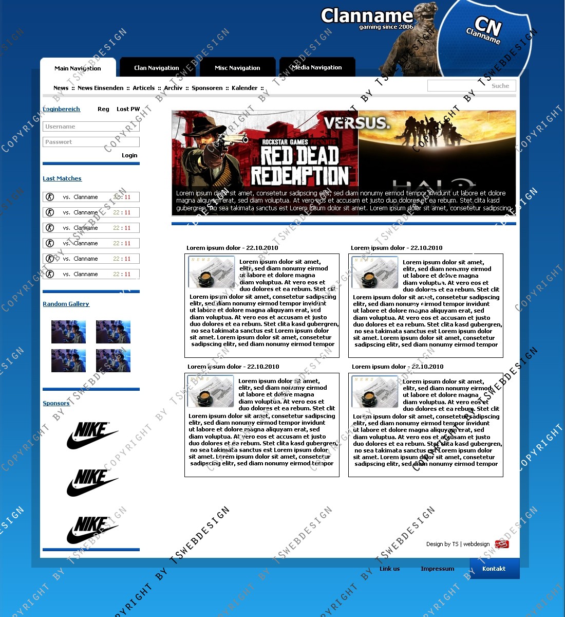 Ein super Design für ein Clan. Die Farben sind Blau-Weiß , auch änderbar als Zusatzmodul. Oben eine Figur von Mordern Warfare 2, dort können natürlich auch andere Darsteller hin designed werden, dass ist Ihnen überlassen. Das Logo habe ich passend zur page gemacht wo man nur noch den Clanname etc. richtig umbennen muss.