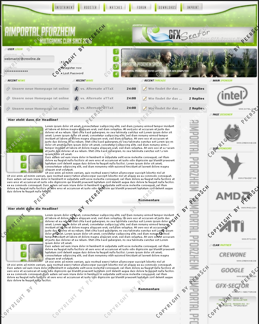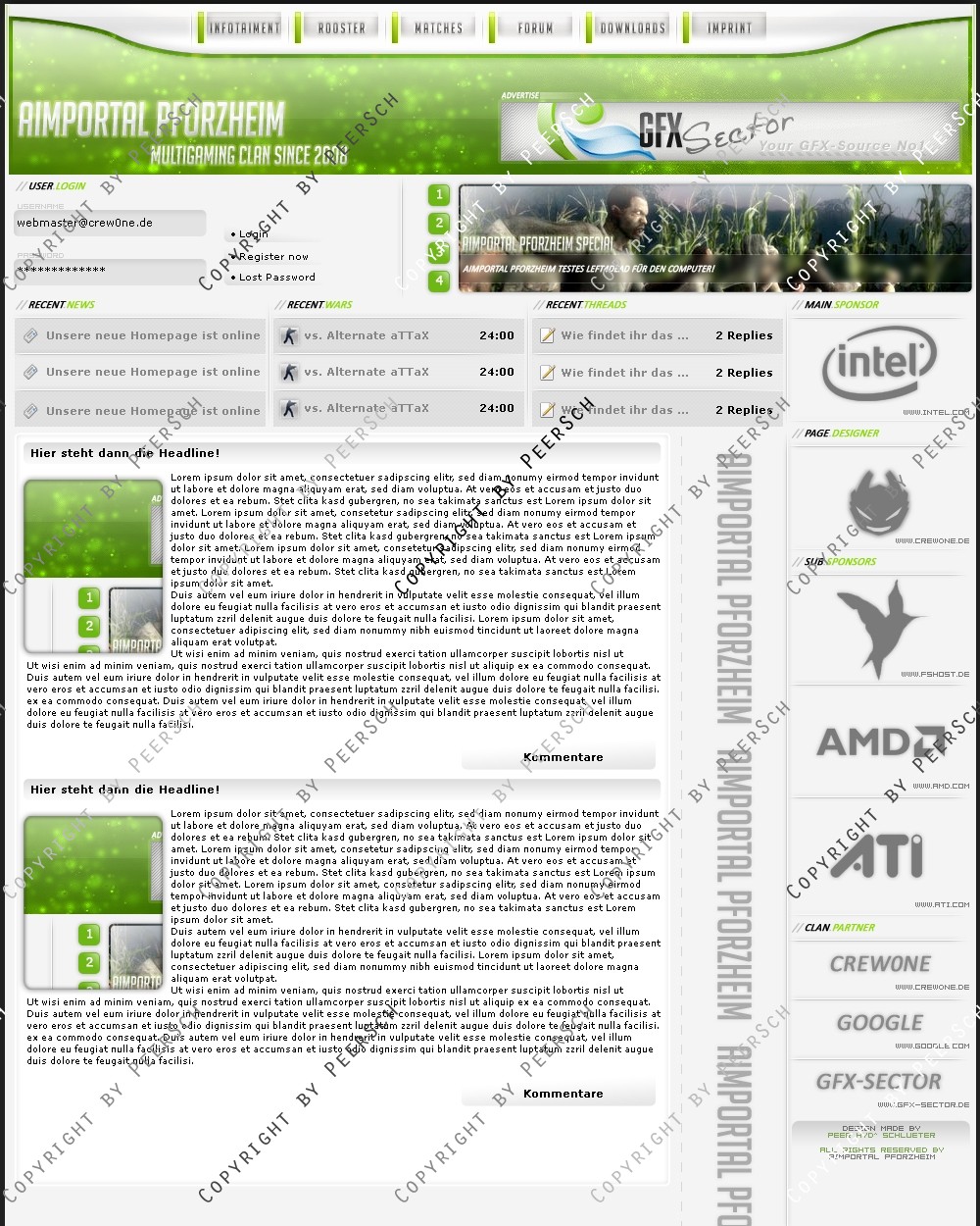Zu einem meiner Meinung nach unschlagbaren Preis! Was Sie hier kaufen ist lediglich die PSD Datei, gerne kann ich es Ihnen gegen einen Aufpreis von 12,50€ an ein CMS Anpassen, zur Auswahl stehen hierbei: webSPELL, Clansphere, Teklab, Devilz und andere CMS auf Anfrage ohne Aufpreis.