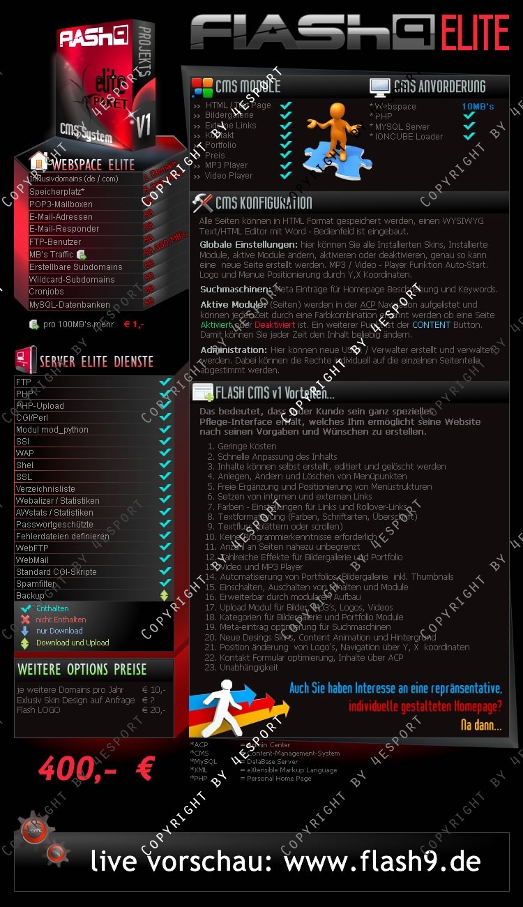 FLASH CMS V1 - Ein Content Management System, Corporate Design, Portfolio, Gallery, Mp3 Player, Video Player, Kontakt und Preiss Formular, V1 die Perfekte Flash CMS für Privat & Firmen.