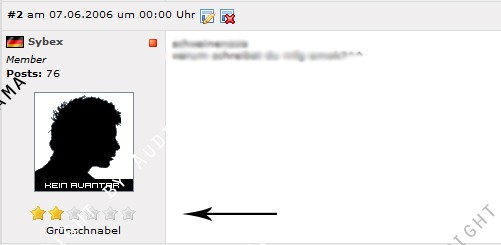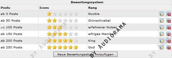 Mit diesem Mod lassen sich Ränge definieren, die ab einer bestimmten Anzahl von Forenposts erreicht werden können. Zu dem Rang selber werden eine für den Rang definierte Anzahl an Icons (hier Sterne) angezeigt, welche für einen Admin bzw. Forenmoderator auch in einer anderen Farbe dargestellt werden kann. Einstellbar ist das ganze bequem über einen neuen Eintrag im Adminmenu.