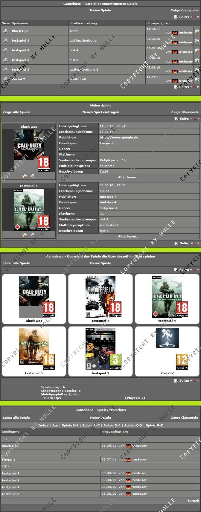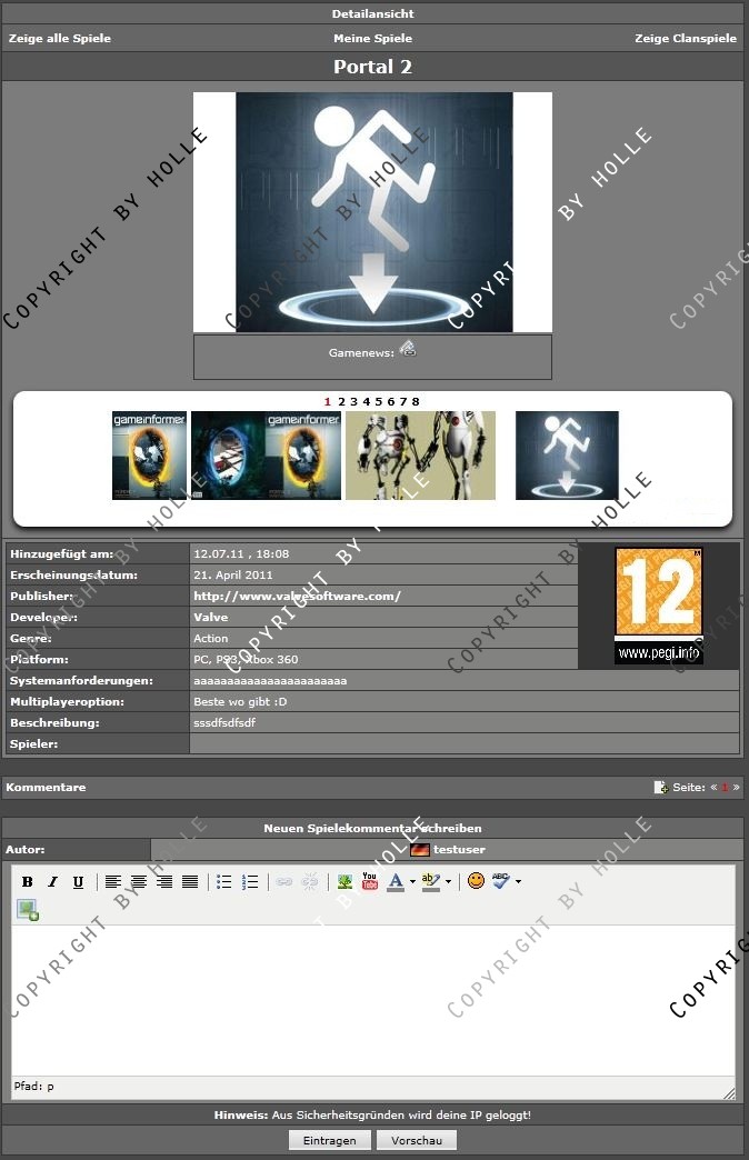 Angelehnt an das System der ESL habe ich hier eine Verwaltung für Spiele im Clan oder in der Community gecode, für die sich Member eintragen können. Zusätzlich können die Member im Clan eigene Spiele einreichen, indem sie ein Formular ausfüllen. (Dieses Feature kann aber vom Admin abgeschaltet werden)