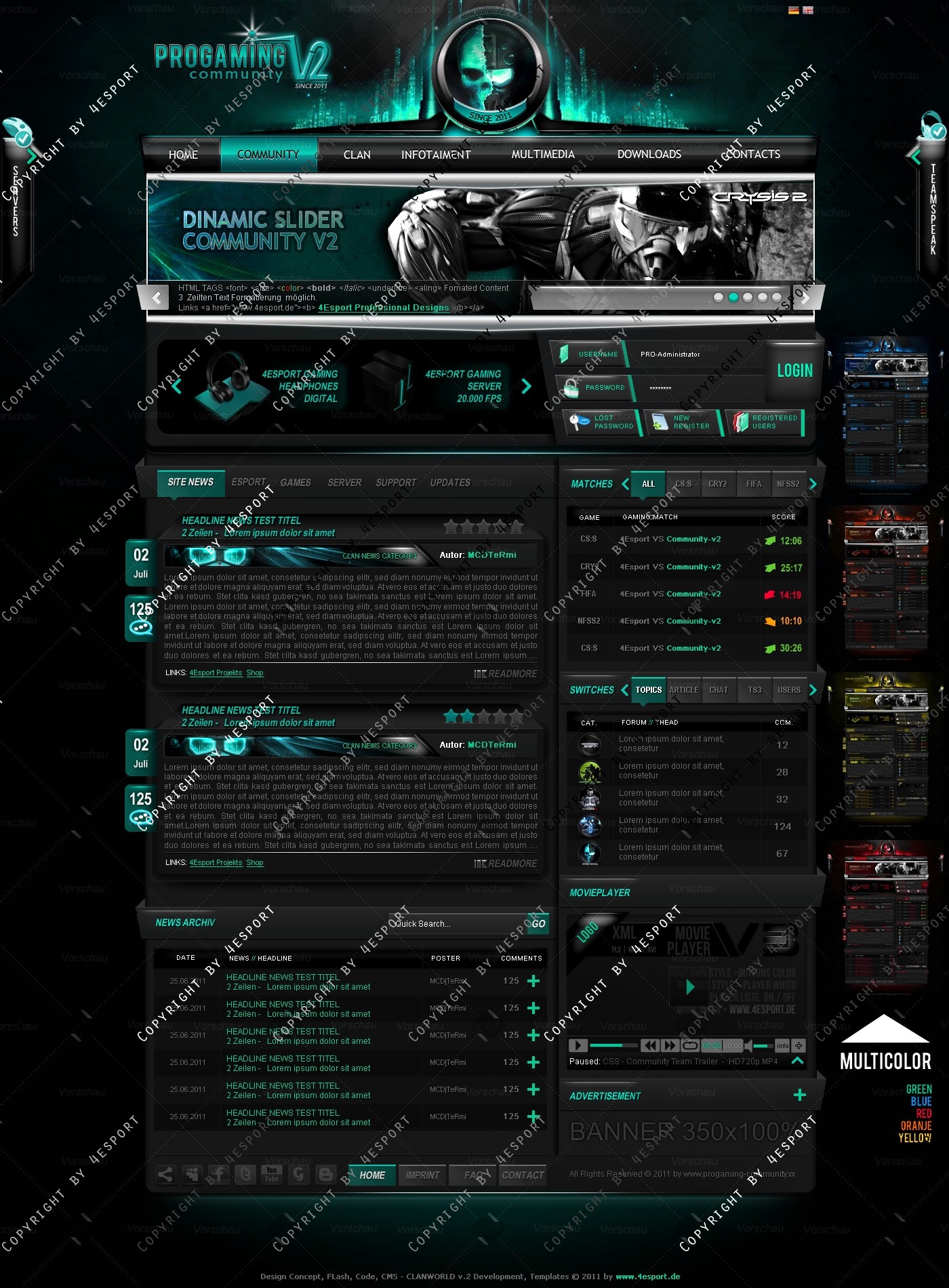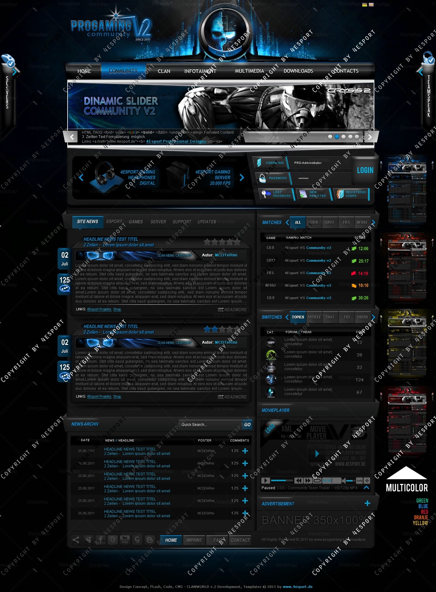 PROGaming Community V2 - Templates Premium Edition mit Flash Player 1 V3 Custom Edition und Featured System, CMS Erweiterung Webspell 4.2.2a, wird auf wünsch auf ClanWORLD v1.1 auch gecodet.