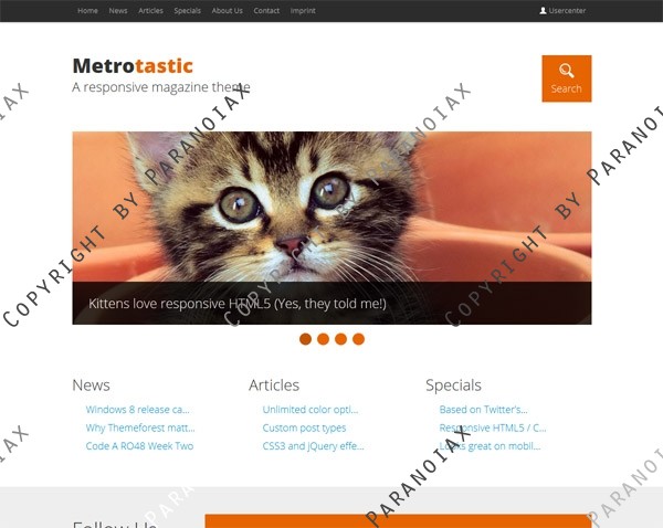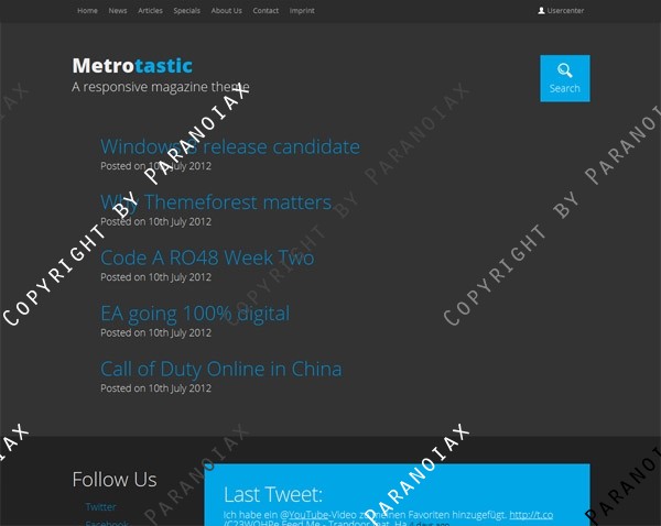 Metrotastic is a responsive HTML5 / CSS3 Theme for WordPress. It is based on Twitter’s Bootstrap Framework – Enhanced with jQuery and custom post types. It’s designed with online magazines in mind and comes with a light and dark color scheme and unlimited color options. It looks fantastic on mobile devices, is easy to setup and has some amazing CSS3 and jQuery effects. Everything right out of the box. So what are you waiting for?