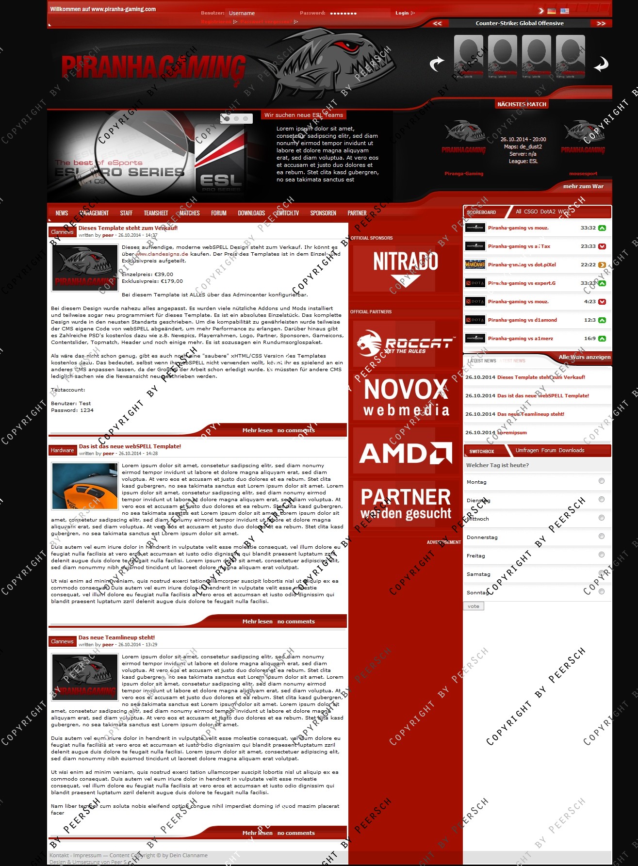 Kostenlos dazu gibt es noch folgende PSD's: Content Slider.psd, Gameicon.psd, Header.psd, Newspic.psd, Partner und Sponsoren.psd, Piranha Logo.psd, Playerrahmen.psd, Squadbanner.psd und Topmatch.psd